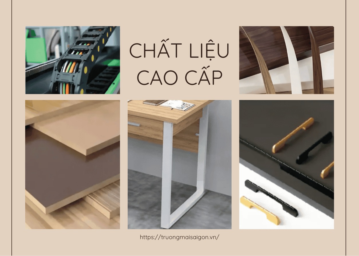 Chất liệu cao cấp: Trường Mai Sài Gòn sử dụng các vật liệu gỗ tự nhiên, MDF phủ melamine, kính cường lực và khung kim loại sơn tĩnh điện – đảm bảo độ bền vượt trội, khả năng chống trầy xước, chống ẩm và dễ vệ sinh. Nhờ đó, bàn làm việc  không chỉ đẹp về hình thức mà còn bền vững theo năm tháng, phù hợp với môi trường làm việc cường độ cao.