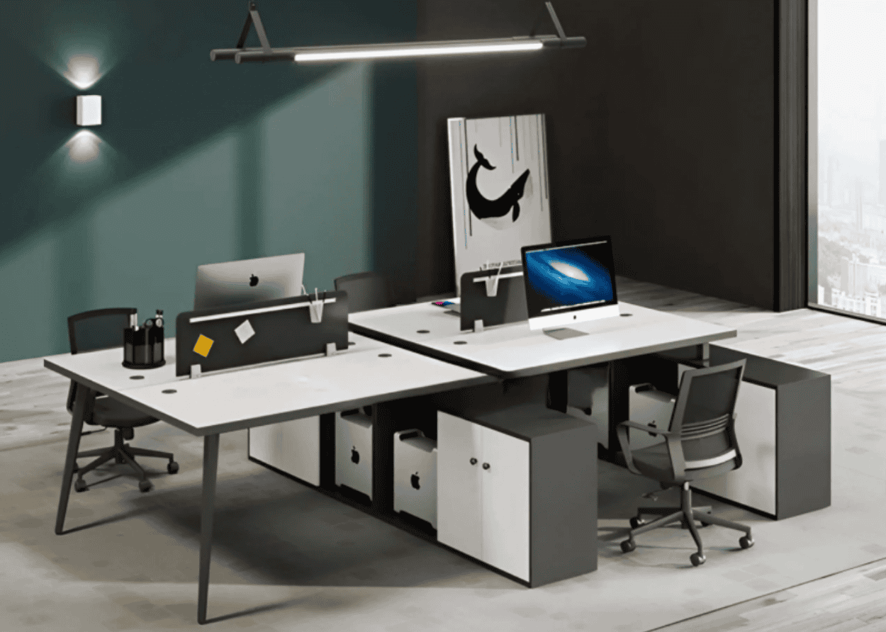 Cụm bàn 4 người là giải pháp nội thất thông minh cho văn phòng hiện đại. Thiết kế gồm 4 bàn ghép liền, chia không gian bằng vách ngăn thấp hoặc kính mờ, kết hợp với tủ cá nhân dưới chân bàn giúp mỗi người có góc riêng nhưng vẫn dễ dàng tương tác.